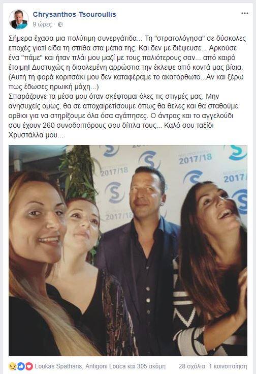 Ο Χρύσανθος Τσουρούλλης την 'αποχαιρέτησε' και διαδικτυακά με ένα post, στο οποίο εξήρε τον επαγγελματισμό και την δύναμη της ψυχής της Χρυστάλλας Πανταζή.