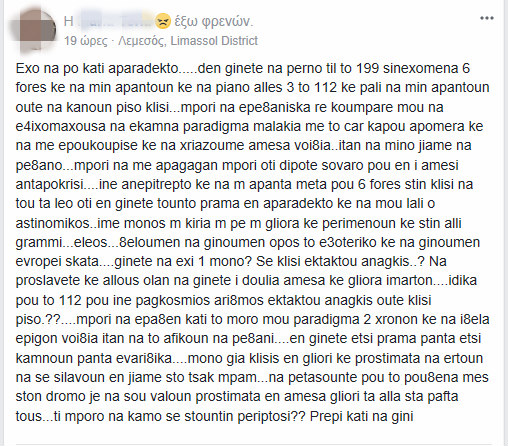 Συγκεκριμένα, σύμφωνα με την δημοσίευση της παραπονούμενης από την Λεμεσό, το βράδυ της Κυριακής 18/2, κάλεσε 9 φορές στα δύο τηλέφωνα έκτακτης ανάγκης, χωρίς ωστόσο, τουλάχιστον αρχικά, να λάβει καμιά απάντηση.