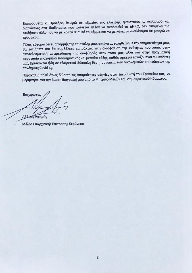 Όπως χαρακτηριστικά γράφει ο κ. Ασπρή, «έχω ενημερώσει πριν από λίγο με επιστολή μου, τον Προέδρο του Δημοκρατικού Κόμματος, κ. Νικόλα Παπαδόπουλο, για την απόφαση μου να αποχωρήσω από το κόμμα».