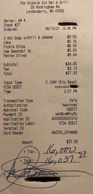 Στις 12 Ιουνίου, ένας πελάτης του «The Stumbling Inn», ο οποίος έκανε λογαριασμό 37,9 δολαρίων, αποφάσισε να αφήσει στον σερβιτόρο ως φιλοδώρημα, το διόλου ευκαταφρόνητο ποσό των 16.000 δολαρίων.