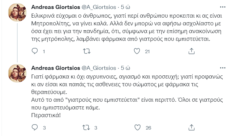 Ο γνωστός παρουσιαστής προέβη και σε δεύτερη ανάρτηση αναφέροντας ότι «ειλικρινά εύχομαι ο άνθρωπος, γιατί περί ανθρώπου πρόκειται κι ας είναι Μητροπολίτης, να γίνει καλά. Αλλά δεν μπορώ να αφήσω ασχολίαστο με όσα έχει πει για την πανδημία, ότι, σύμφωνα με την επίσημη ανακοίνωση της μητρόπολης, λαμβάνει φάρμακα από γιατρούς που εμπιστεύεται