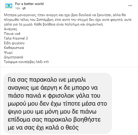Όπως και η περίπτωση αυτής της μητέρας μονογονιού, η οποία απευθύνθηκε στην εθελοντική ομάδα "For a Better world" για βοήθεια, αναφέροντας χαρακτηριστικά το ψυγείο είναι άδειο και δεν έχει ούτε γάλα για το παιδί της.