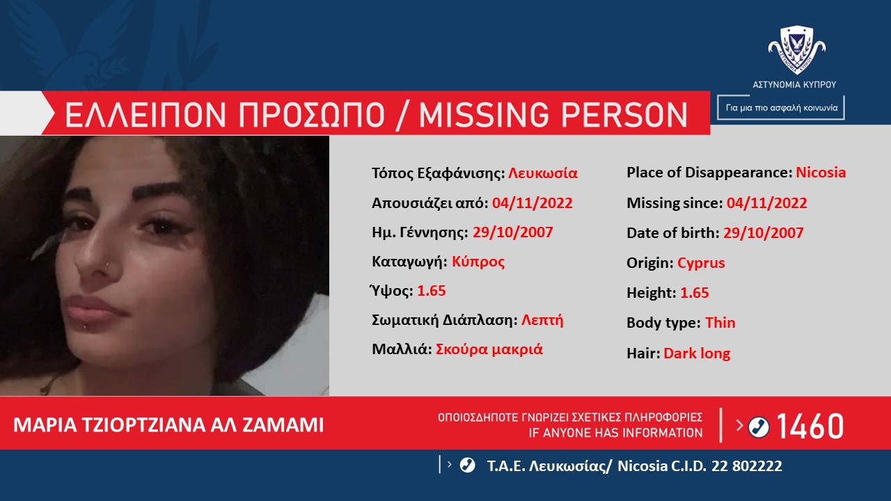 Η 15χρονη περιγράφεται ως λεπτής σωματικής διάπλασης, ύψους 1.65μ. περίπου, με καστανά μάτια και μακριά σκούρα μαλλιά.