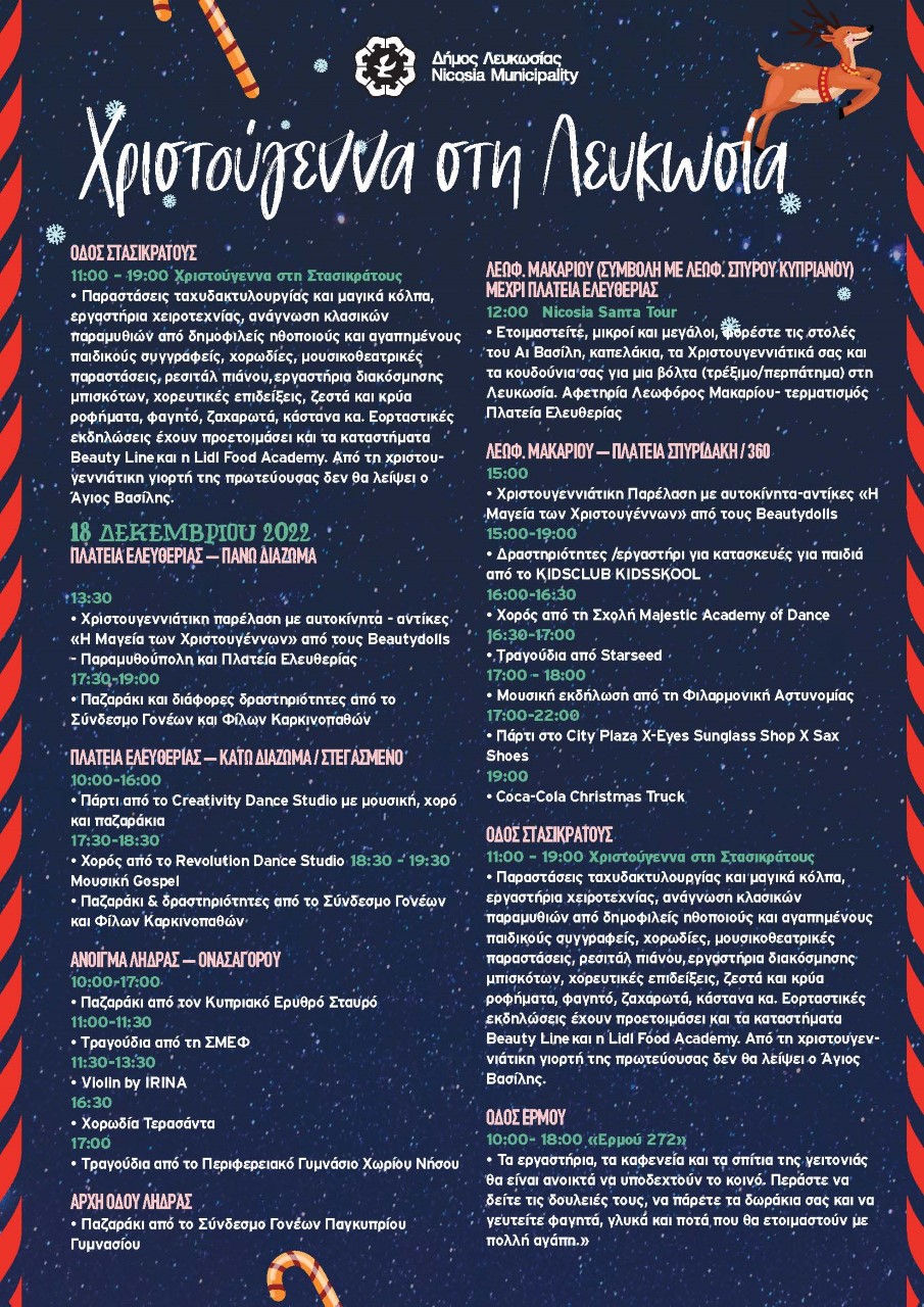 παραστάσεις ταχυδακτυλουργίας και μαγικά κόλπα, εργαστήρια χειροτεχνίας, ανάγνωση κλασικών παραμυθιών από δημοφιλείς ηθοποιούς και αγαπημένους παιδικούς συγγραφείς, χορωδίες, μουσικοθεατρικές παραστάσεις, ρεσιτάλ πιάνου, εργαστήρια διακόσμησης μπισκότων, χορευτικές επιδείξεις, ζεστά και κρύα ροφήματα, φαγητό, ζαχαρωτά, κάστανα κα. Εορταστικές εκδηλώσεις έχουν προετοιμάσει και τα καταστήματα Beauty Line και η Lidl Food Academy. Από τη χριστουγεννιάτικη γιορτή της πρωτεύουσας δεν θα λείψει ο Άγιος Βασίλης.