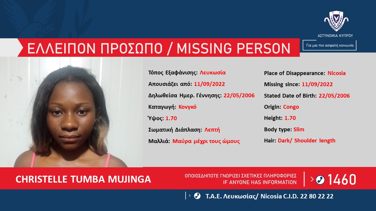 Σύμφωνα με καταγγελία που υποβλήθηκε στην Αστυνομία, τη Δευτέρα, 16 Ιανουαρίου, 2023, η 16χρονη απουσιάζει από τον χώρο διαμονής της στη Λευκωσία, από τις 11 Σεπτεμβρίου, 2022.