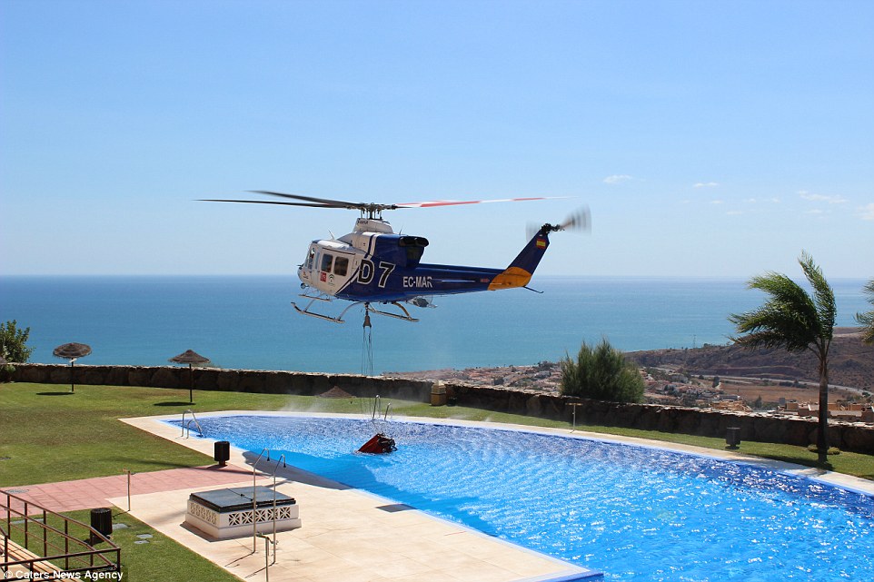 Με προσοχή, ο πιλότος -τα στοιχεία του οποίου δεν έχουν δοθεί στη δημοσιότητα- πλησίασε μια οικία και αφού χαμήλωσε πάνω από την πισίνα, γέμισε το καλάθι με νερό, ανυψώθηκε και απομακρύνθηκε, για να το ρίξει στη συνέχεια σε εστία φωτιάς δίπλα στο σπίτι.
