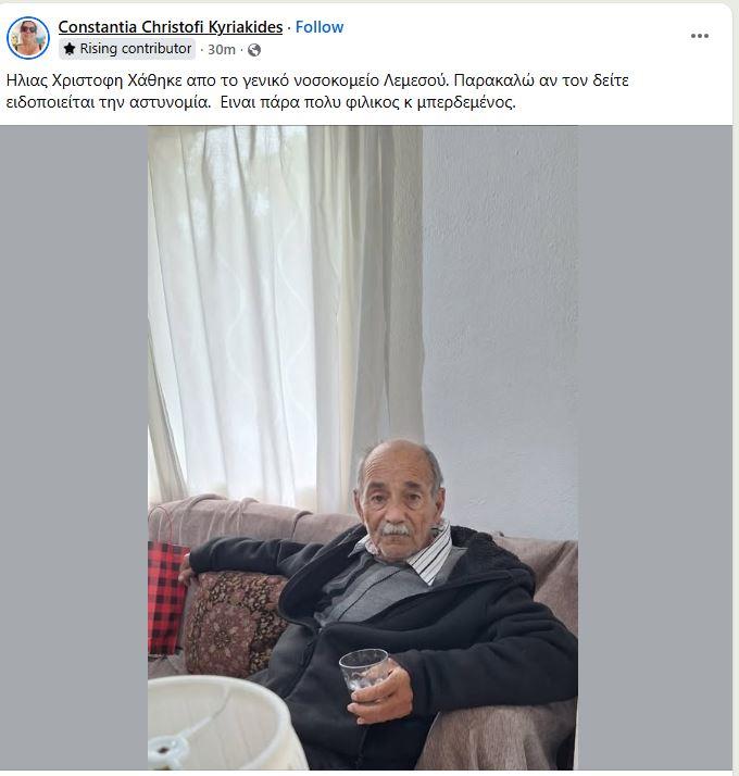 Πρόκειται για τον Ηλία Χριστοφή, με αρκετούς κάνουν να έκκληση σε όποιον τον δει να εντοπίσει την Αστυνομία.