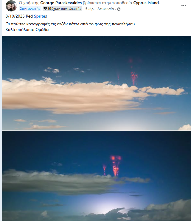 Ένα εξαιρετικά σπάνιο και εντυπωσιακό φυσικό φαινόμενο, γνωστό ως Red Sprites, καταγράφηκε στον ουρανό της Κύπρου το βράδυ της 8ης Οκτωβρίου 2025, κάτω από το φως της πανσελήνου.