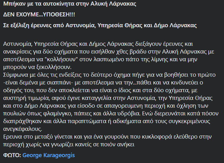 Αστυνομία, Υπηρεσία Θήρας και Δήμος Λάρνακας διεξάγουν έρευνες και ανακρίσεις για δύο οχήματα που εισήλθαν χθες βράδυ στην Αλυκή Λάρνακας με αποτέλεσμα να “κολλήσουν” στον λασπωμένο πάτο της λίμνης και να μην μπορούν να ξεκολλήσουν.