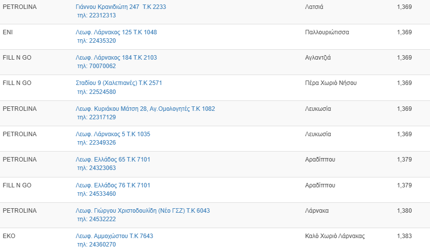Σύμφωνα με το παρατηρητήριο λιανικών τιμών καυσίμων της Υπηρεσίας Προστασίας Καταναλωτή, η μέση τιμή της αμόλυβδης βενζίνης 95 παγκύπρια είναι €1,351 με την φθηνότερη τιμή να είναι €1,282 και την ακριβότερη €1,446 .