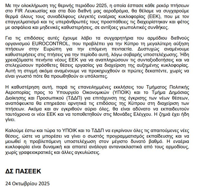 Παρά την ολοκλήρωση μιας θερινής περιόδου-ρεκόρ, κατά την οποία η Κύπρος διαχειρίστηκε με επιτυχία και μηδενικές καθυστερήσεις τον υψηλότερο αριθμό πτήσεων που έχει καταγραφεί ποτέ, ο Σύνδεσμος τονίζει πως η συνέχιση αυτής της επίδοσης δεν μπορεί να διασφαλιστεί χωρίς την άμεση στελέχωση των υπηρεσιών.