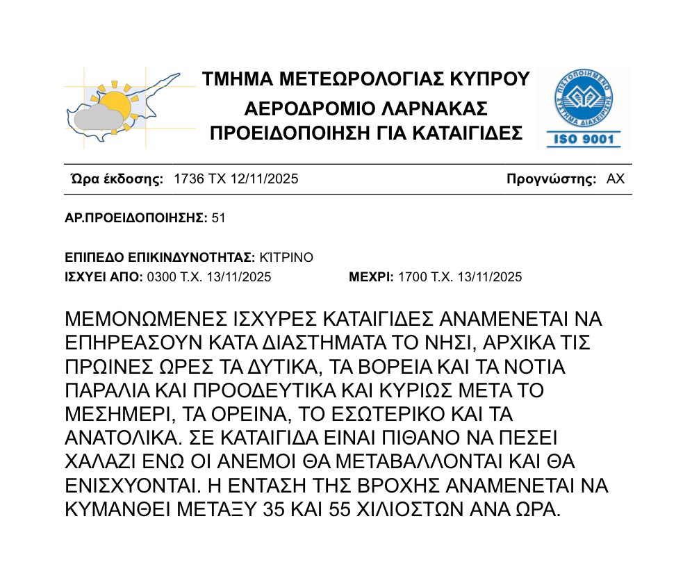 Σύμφωνα με την ανακοίνωση, μεμονωμένες αλλά ισχυρές καταιγίδες αναμένεται να επηρεάσουν κατά διαστήματα όλο το νησί, αρχικά τα δυτικά, βόρεια και νότια παράλια και στη συνέχεια, μετά το μεσημέρι, τα ορεινά, το εσωτερικό και τα ανατολικά.