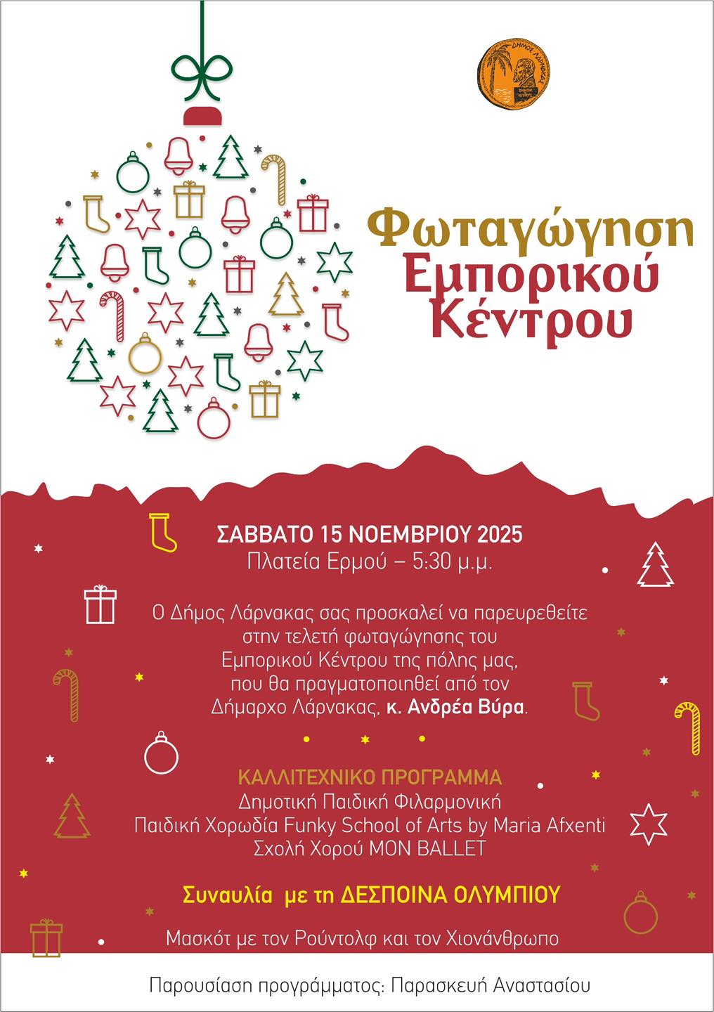 Ο Δήμος Λάρνακας σας προσκαλεί όλους – μικρούς και μεγάλους – στην τελετή φωταγώγησης του Εμπορικού Κέντρου, που θα πραγματοποιηθεί από τον Δήμαρχο Λάρνακας κ. Ανδρέα Βύρα.