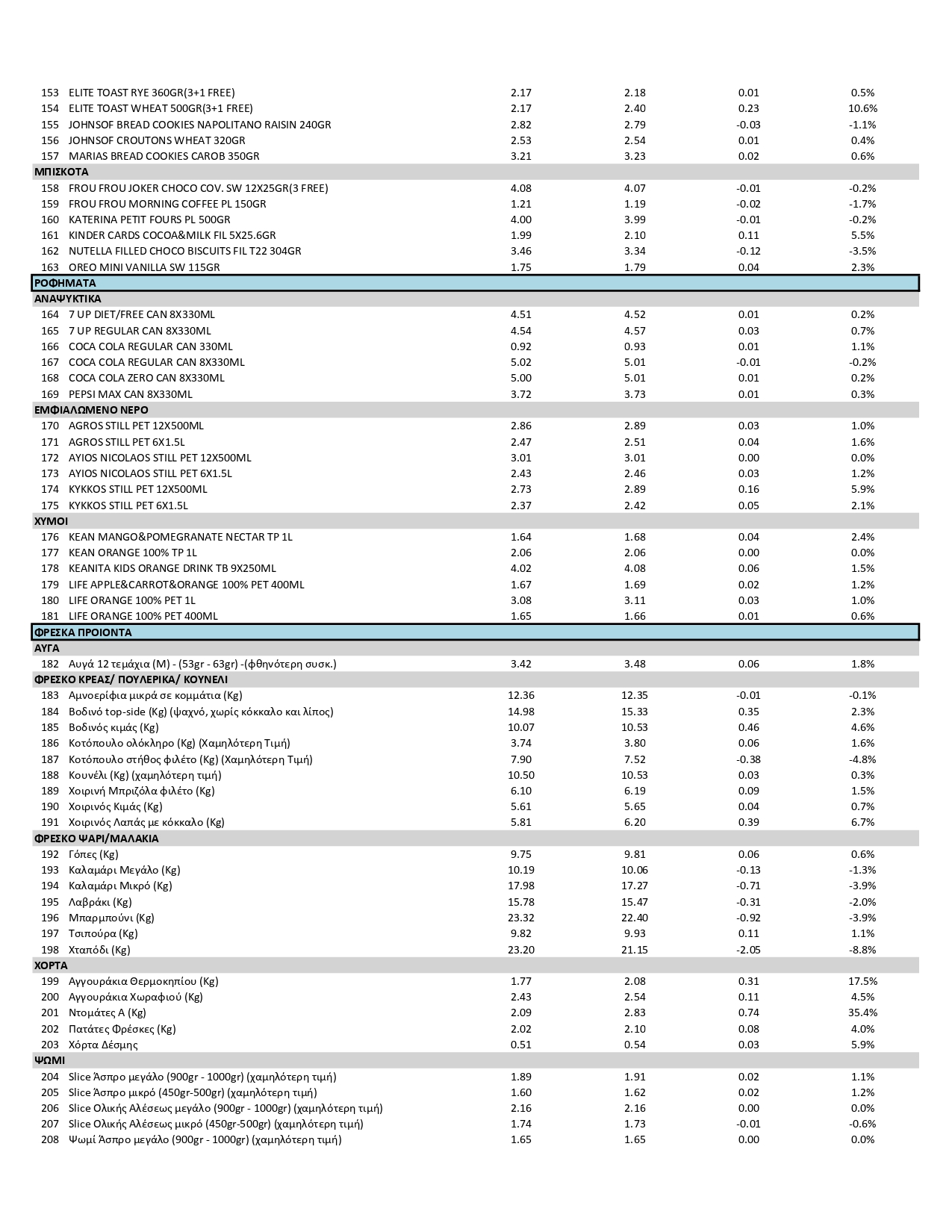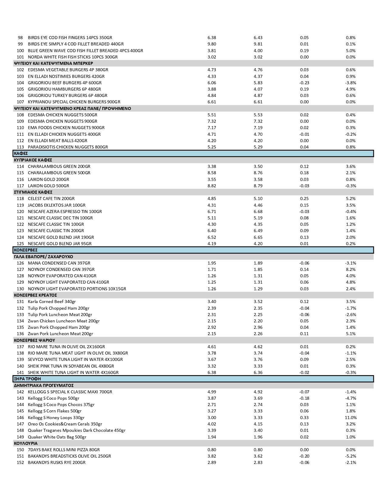 Σύμφωνα με την Υπηρεσία Προστασίας Καταναλωτή, σε σύνολο 45 κατηγοριών βασικών προϊόντων, 33 κατηγορίες κατέγραψαν συγκρατημένη αύξηση έναντι Σεπτεμβρίου σε ποσοστό κάτω του 3% εκτός δύο περιπτώσεων (οι 18 κατηγορίες παρουσιάζουν μειώσεις μέχρι και 16% έναντι του περσινού Οκτώβρη), 11 κατηγορίες κατέγραψαν μείωση και 1 κατηγορία καμία μεταβολή (κατεψυγμένα ψάρια πανέ και προψημένα).