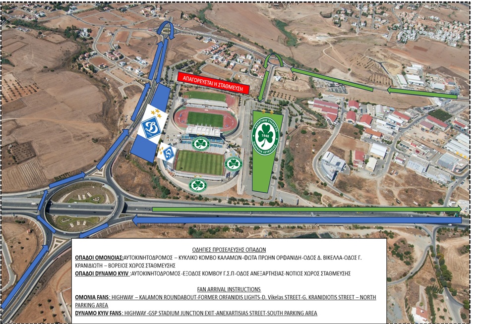 Οι φίλαθλοι της DYNAMO KYIV θα καταλάβουν τις νότιες κερκίδες του σταδίου, ως εκ τούτου, προτρέπονται να κατευθυνθούν στο στάδιο μέσω του κυκλικού κόμβου του Γ.Σ.Π. και της λεωφόρου Ανεξαρτησίας και να σταθμεύσουν τα οχήματα και τα λεωφορεία στον νότιο χώρο στάθμευσης οχημάτων.