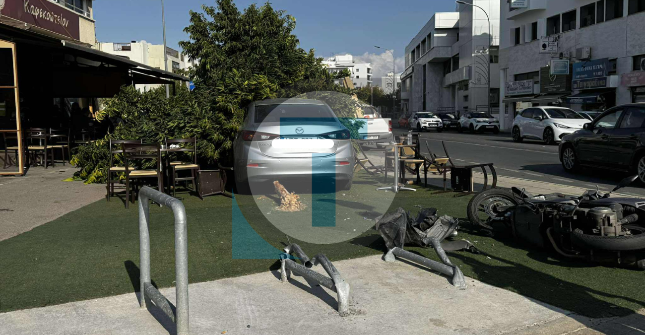 Το όχημα παρέσυρε τραπέζια, καρέκλες, και μεταξύ άλλων σταθμευμένη μοτοσικλέτα.