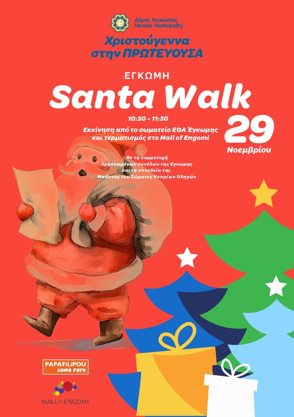 Η ημέρα θα ξεκινήσει στις 10:30 με το Santa Walk, που θα έχει αφετηρία το Σωματείο ΕΘΑ Έγκωμης, καλώντας μικρούς και μεγάλους να φορέσουν τις στολές τους και να δώσουν όλοι μαζί το πιο ζεστό ξεκίνημα στη μεγάλη γιορτή της περιοχής.