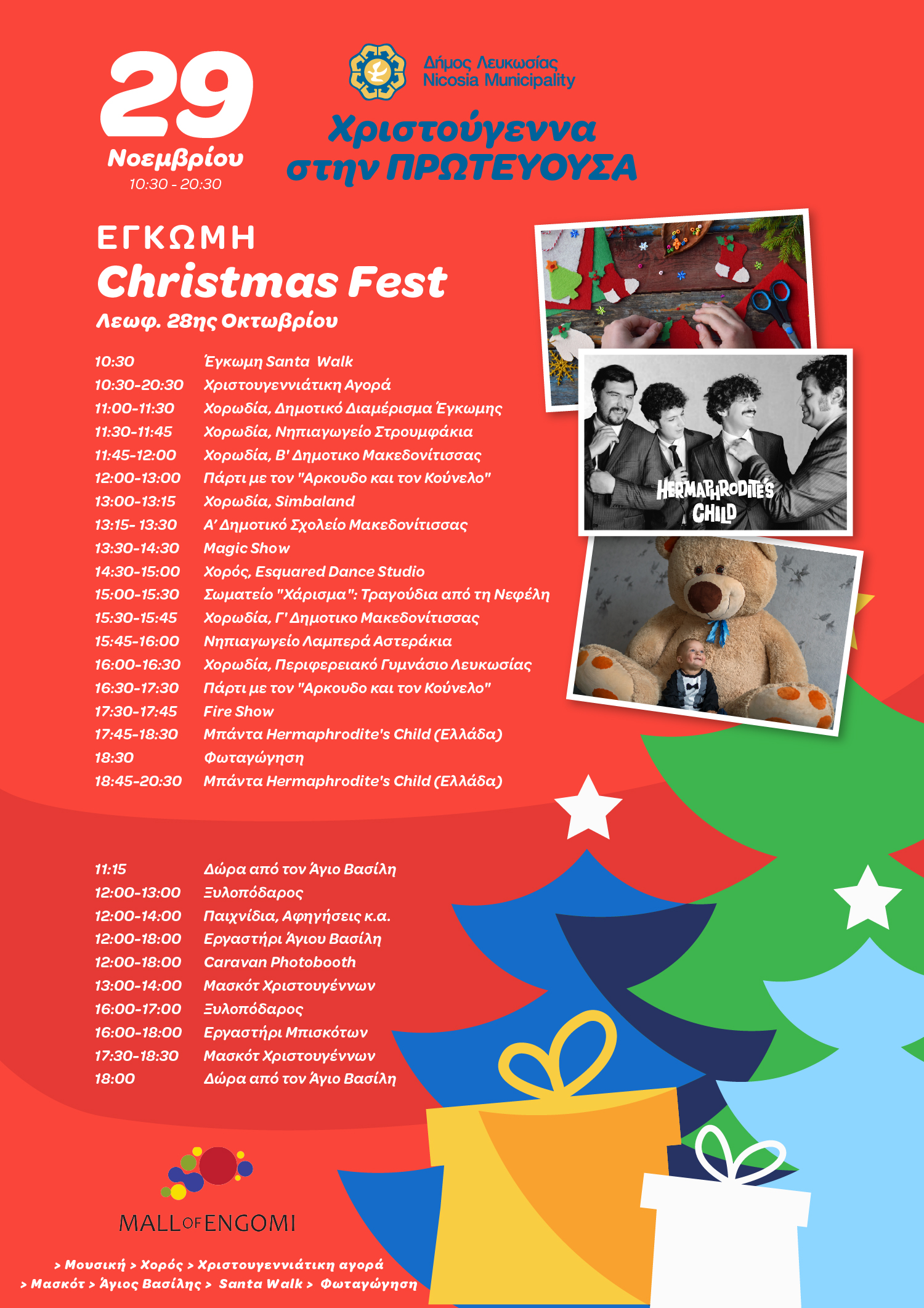 Το Engomi Christmas Fest 2025 υπόσχεται μια ολόκληρη μέρα γεμάτη φως, χαρά και χριστουγεννιάτικη μαγεία. Το πρόγραμμα έχει σχεδιαστεί έτσι ώστε να προσφέρει εμπειρίες για όλες τις ηλικίες και να μεταφέρει το γιορτινό πνεύμα σε κάθε γωνιά της εκδήλωσης.
