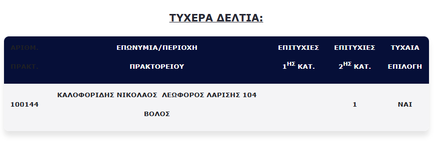 Επίσης, ένα (1) τυχερό δελτίο βρέθηκε στη 2η κατηγορία (5), το οποίο κερδίζει το ποσό των €100.000,00.