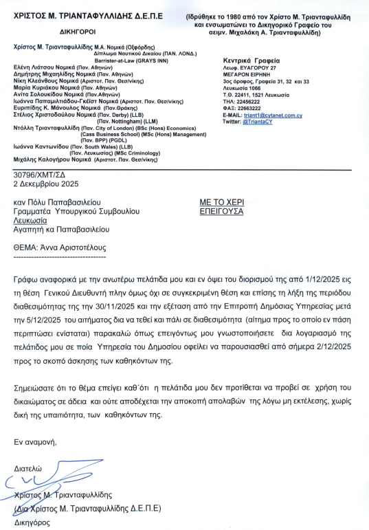 "Γράφω αναφορικά με την ανωτέρω πελάτιδα μου και εν όψει του διορισμού της από 1/12/2025 εις τη θέση Γενικού Διευθυντή πλην όμως όχι σε συγκεκριμένη θέση και επίσης τη λήξη της περιόδου διαθεσιμότητας της την 30/11/2025 και την εξέταση από την Επιτροπή Δημόσιας Υπηρεσίας μετά την 5/12/2025 του αιτήματος δια να τεθεί και πάλι σε διαθεσιμότητα (αίτημα προς το οποίο εν πάση περιπτώσει ενίσταται), παρακαλώ όπως επειγόντως μου γνωστοποιήσετε δια λογαριασμό της πελάτιδος μου σε ποία Υπηρεσία του Δημοσίου οφείλει να παρουσιασθεί από σήμερα 2/12/2025 προς το σκοπό άσκησης των καθηκόντων της", αναφέρει ο δικηγόρος της.