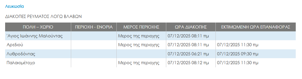 Σύμφωνα με την ισοτσελίδα της ΑΗΚ, η αποκατάσταση να υπολογίζεται γύρω στις 11:00.