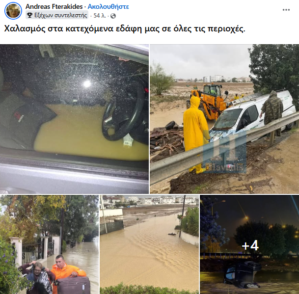 Ανάφερε ότι πλημμύρισαν δρόμοι και υποστατικά ενώ η «πολιτική προστασία» επενέβη σε πολλά περιστατικά για απομάκρυνση πολιτών από τα υποστατικά τους.