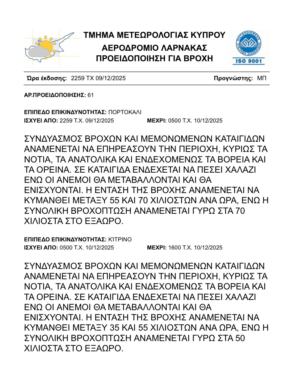 Νέα κίτρινη προειδοποίηση εξέδωσε το Τμήμα Μετεωρολογίας, με ισχύ από τις 5 τα ξημερώματα ως τις 4 το απόγευμα.