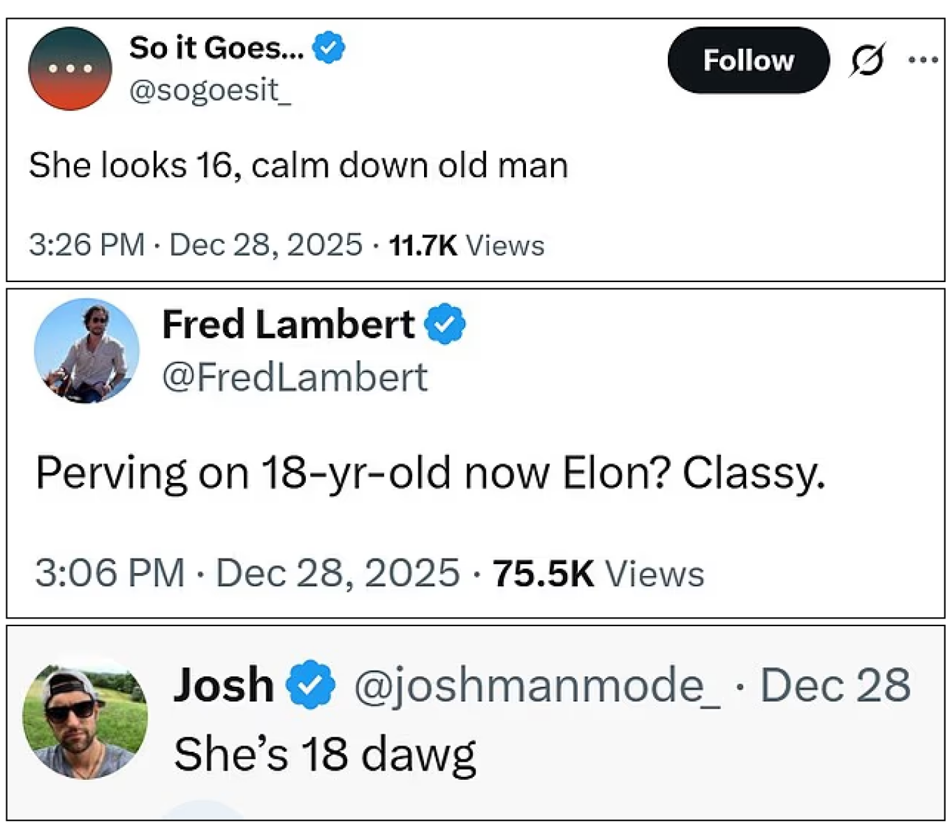 Από την πλευρά τους οι χρήστες του Χ ήταν πολύ πιο αυστηροί με τον Μασκ κατακρίνοντας τον 54χρονο δισεκατομμυριούχο για την «επιθετική συμπεριφορά» του απέναντι στην 19χρονη. «Ηρέμησε, γέρο», έγραψε ένας σχολιαστής, «είσαι ένας ανατριχιαστικός χαμένος. Δισεκατομμύρια δολάρια και ακόμα ανατριχιαστικός» πρόσθεσε ένας δεύτερος. «Ήσουν 36 όταν γεννήθηκε» παρατήρησε ένας τρίτος, «μοιάζει 16, ηρέμησε» συμπλήρωσε ένας τέταρτος.