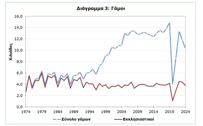 Ο συνολικός αριθμός των γάμων το 2024 μειώθηκε στους 10.334 από 11.766 τον προηγούμενο χρόνο.