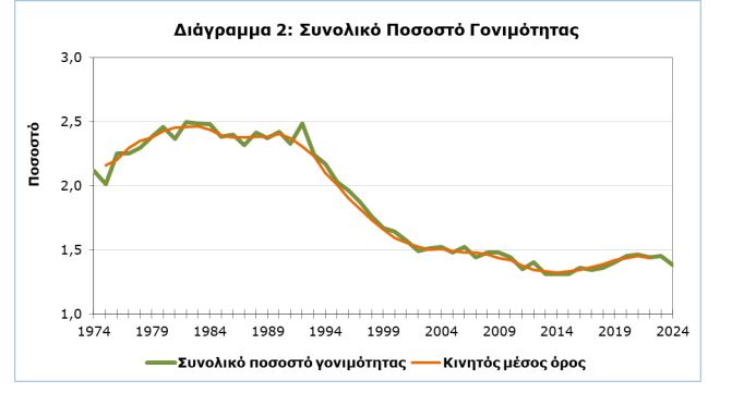 Το 2024 το συνολικό ποσοστό γονιμότητας υπολογίστηκε στο 1,4, παραμένοντας στα ίδια επίπεδα με τον προηγούμενο χρόνο. Το συνολικό ποσοστό γονιμότητας εξακολουθεί να παραμένει σε χαμηλά επίπεδα σε σχέση με το 1982 (2,5), όπου παρατηρήθηκε το πιο ψηλό ποσοστό από το 1974 και μετά. Από το 1995 το συνολικό ποσοστό γονιμότητας είναι πιο χαμηλό από το 2,1 – ποσοστό αναγκαίο για να εξασφαλιστεί η αναπλήρωση του πληθυσμού.