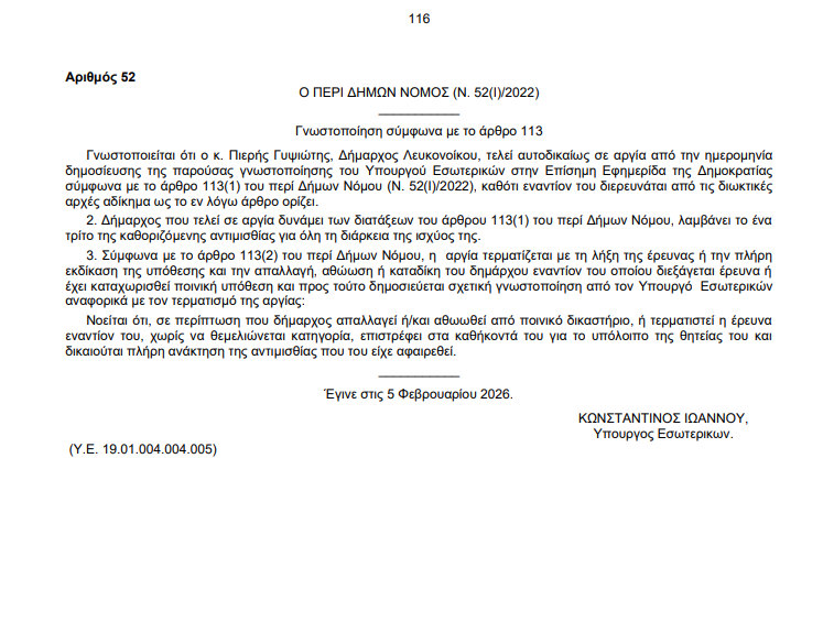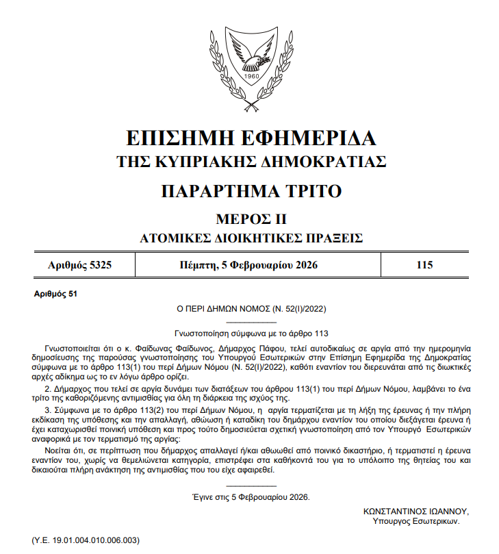 Οι γνωστοποιήσεις που υπογράφονται από τον Υπουργό Εσωτερικών, Κωνσταντίνο Ιωάννου, αναφέρουν ότι ο καθένας από τους δυο Δημάρχους τελεί "αυτοδικαίως σε αργία από την ημερομηνία δημοσίευσης της παρούσας γνωστοποίησης" του Υπουργού Εσωτερικών στην Επίσημη Εφημερίδα της Δημοκρατίας, σύμφωνα με το άρθρο 113(1) του περί Δήμων Νόμου (Ν. 52(Ι)/2022), "καθότι εναντίον του διερευνάται από τις διωκτικές αρχές αδίκημα ως το εν λόγω άρθρο ορίζει".