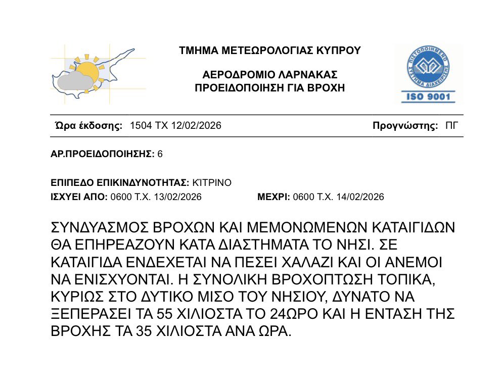 Προειδοποίηση για συνδυασμό βροχών και καταιγίδων εξέδωσε το Τμήμα Μετεωρολογίας.
