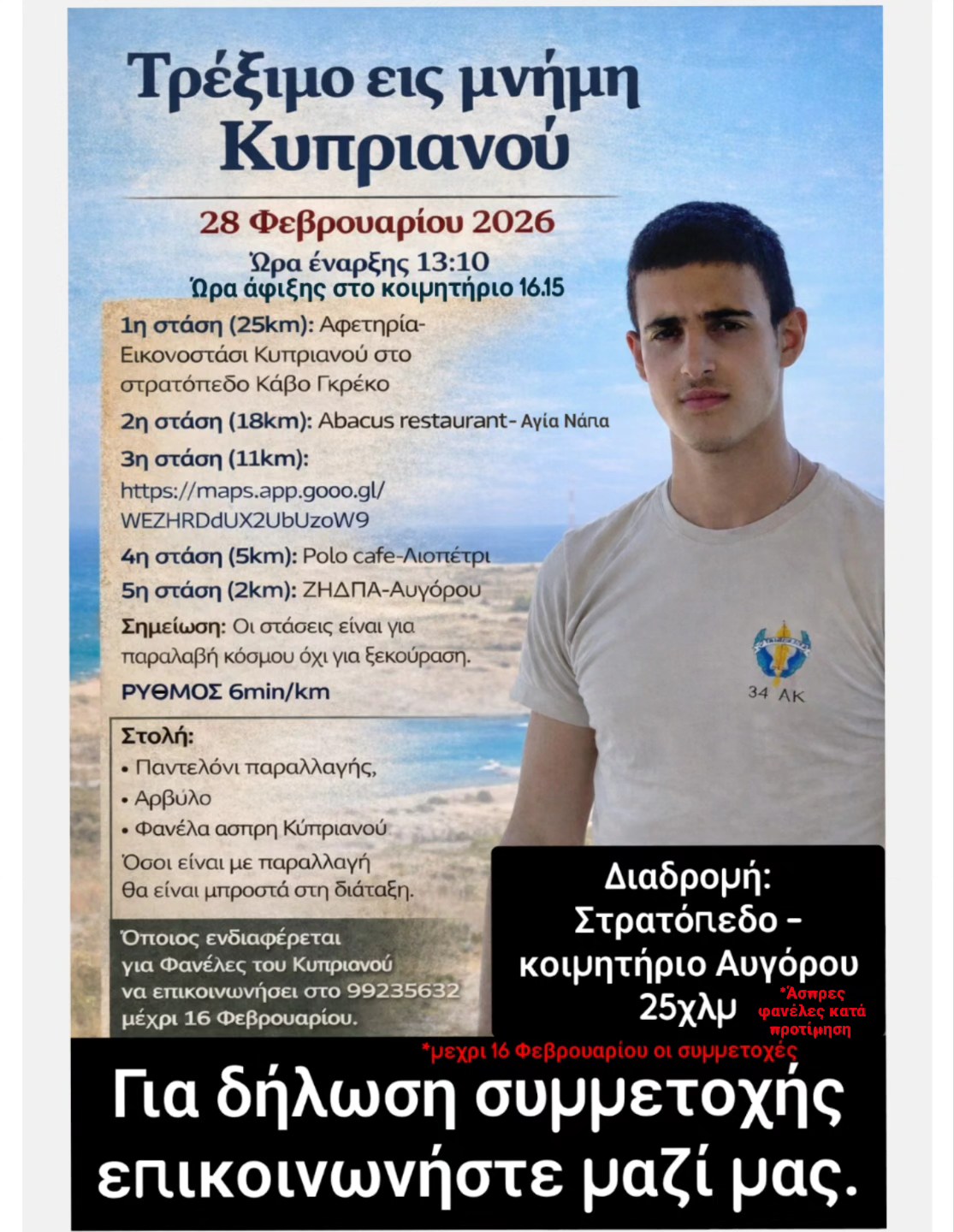 Τρέξιμο εις μνήμη του Κυπριανού πραγματοποιούν ΛΟΚατζήδες στην Κοινότητα Αυγόρου. «Η μνήμη του Αδελφού μας Κυπριανού δεν πρέπει ποτέ να ξεθωριάσει. Καθήκον όλων μας είναι να τη διατηρήσουμε άσβεστη και να τη μεταφέρουμε ως παρακαταθήκη στις νέες γενιές των ΛΟΚ αλλά και σε όλους μας, ως παράδειγμα ήθους, θάρρους και αυταπάρνησης. Τρέχουμε για ΑΥΤΟΝ αλλά και για ΟΛΕΣ τις ψυχές που έφυγαν από τη ζωή, εκείνη τη μαύρη μέρα. Τιμούμε τη θυσία, την προσφορά και το αποτύπωμα που άφησε στις καρδιές μας. Η παρουσία και η συμμετοχή σας αποτελεί ελάχιστο φόρο τιμής».