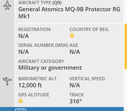 Σύμφωνα με τα στοιχεία της εφαρμογής, πρόκειται για στρατιωτικό μη επανδρωμένο αεροσκάφος (drone) της Βασιλικής Πολεμικής Αεροπορίας του Ηνωμένου Βασιλείου (Royal Air Force), τύπου General Atomics MQ-9B Protector RG Mk1. Το συγκεκριμένο drone ανήκει στη νέα γενιά στρατιωτικών μη επανδρωμένων αεροσκαφών και χρησιμοποιείται κυρίως για αποστολές επιτήρησης, αναγνώρισης και συλλογής πληροφοριών.