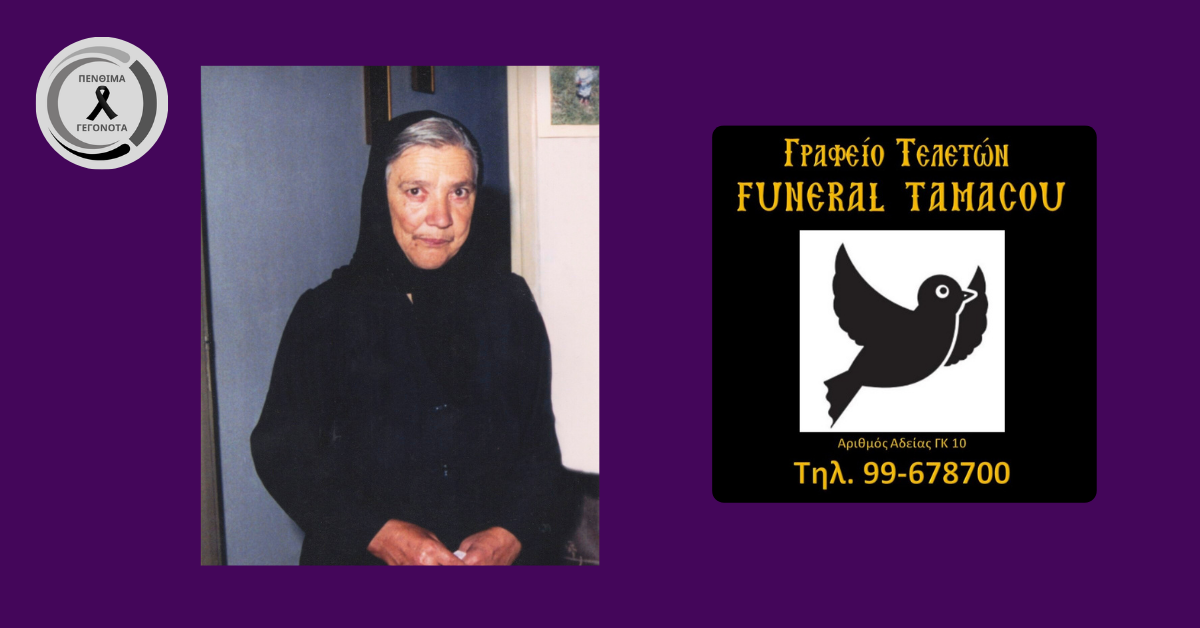 Η Εξόδιος Ακολουθία θα τελεστεί από τον Ιερό Ναό Αποστόλου Λουκά στο Παλαιχώρι, την Πέμπτη 05 Μαρτίου 2026, ώρα 15:00 και καλούμε όλους, όσοι τιμούν την μνήμη της να παραστούν.