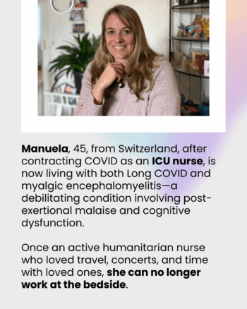 «Η Manuela, 45 ετών, από την Ελβετία, αφού νόσησε με COVID ως νοσηλεύτρια ΜΕΘ, ζει πλέον με Long COVID και μυαλγική εγκεφαλομυελίτιδα – μια εξουθενωτική κατάσταση που περιλαμβάνει κακουχία μετά από προσπάθεια και γνωστική δυσλειτουργία. Ενώ παλαιότερα ήταν δραστήρια νοσηλεύτρια με ανθρωπιστική δράση και αγαπούσε τα ταξίδια, τις συναυλίες και τον χρόνο με αγαπημένα πρόσωπα, δεν μπορεί πλέον να εργάζεται δίπλα στον ασθενή».