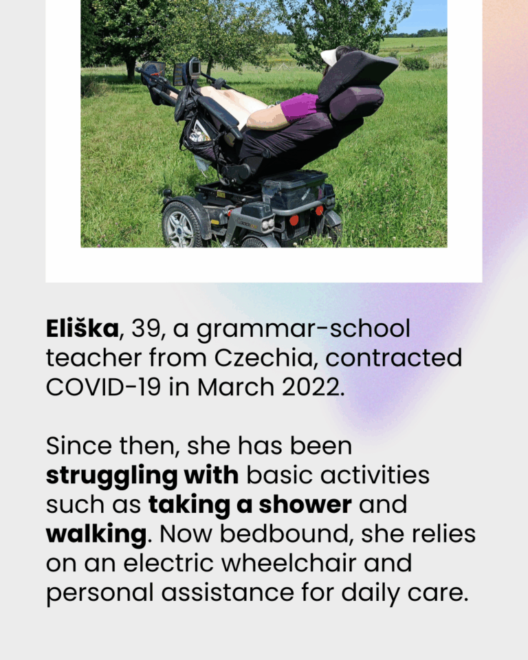 «Η Eliška, 39 ετών, δασκάλα από την Τσεχία, νόσησε με COVID-19 τον Μάρτιο του 2022. Από τότε δυσκολεύεται ακόμη και σε βασικές δραστηριότητες, όπως να κάνει ντους και να περπατήσει. Σήμερα είναι κατάκοιτη, βασίζεται σε ηλεκτρικό αμαξίδιο και χρειάζεται προσωπική βοήθεια για την καθημερινή φροντίδα».