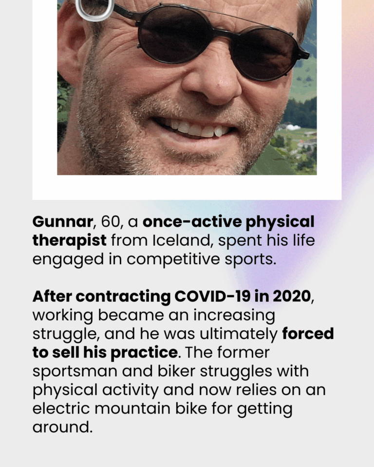 «Ο Gunnar, 60 ετών, πρώην δραστήριος φυσικοθεραπευτής από την Ισλανδία, πέρασε τη ζωή του στον ανταγωνιστικό αθλητισμό. Αφού νόσησε με COVID-19 το 2020, η εργασία έγινε όλο και πιο δύσκολη και τελικά αναγκάστηκε να πουλήσει το ιατρείο του. Ο άλλοτε αθλητής και ποδηλάτης δυσκολεύεται πλέον στη σωματική δραστηριότητα και χρησιμοποιεί ηλεκτρικό ποδήλατο βουνού για τις μετακινήσεις του».