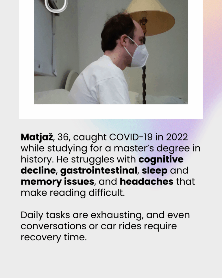 «Ο Matjaž, 36 ετών, νόσησε με COVID-19 το 2022 ενώ έκανε μεταπτυχιακό στην Ιστορία. Αντιμετωπίζει γνωστική έκπτωση, γαστρεντερικά προβλήματα, δυσκολίες στον ύπνο και στη μνήμη, καθώς και πονοκεφάλους που κάνουν το διάβασμα δύσκολο. Οι καθημερινές δραστηριότητες τον εξαντλούν, ενώ ακόμη και μια συζήτηση ή μια διαδρομή με το αυτοκίνητο απαιτεί χρόνο ανάρρωσης».