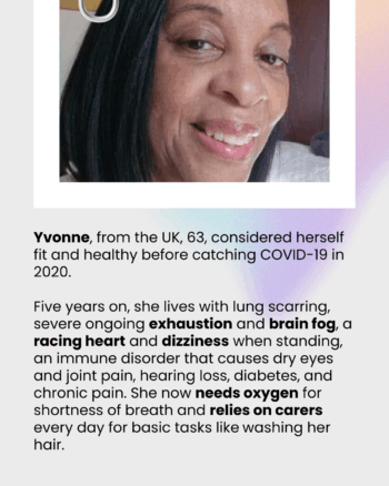 «Η Yvonne από το Ηνωμένο Βασίλειο, 63 ετών, θεωρούσε τον εαυτό της σε καλή φυσική κατάσταση και υγιή πριν νοσήσει με COVID-19 το 2020. Πέντε χρόνια μετά, ζει με βλάβες στους πνεύμονες, σοβαρή και επίμονη εξάντληση και «εγκεφαλική ομίχλη», ταχυκαρδίες και ζάλη όταν σηκώνεται, καθώς και ανοσολογική διαταραχή που προκαλεί ξηροφθαλμία, αρθραλγίες, απώλεια ακοής, διαβήτη και χρόνιο πόνο. Πλέον χρειάζεται οξυγόνο για τη δύσπνοια και βασίζεται καθημερινά σε φροντιστές για βασικές ανάγκες, όπως το λούσιμο των μαλλιών».