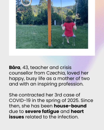 «Η Bára, 43 ετών, δασκάλα και σύμβουλος σε κρίσεις από την Τσεχία, αγαπούσε την χαρούμενη, γεμάτη ζωή της ως μητέρα δύο παιδιών και το εμπνευσμένο επάγγελμά της. Νόσησε για τρίτη φορά με COVID-19 την άνοιξη του 2025. Από τότε είναι περιορισμένη στο σπίτι, λόγω έντονης κόπωσης και καρδιακών προβλημάτων που σχετίζονται με τη λοίμωξη».