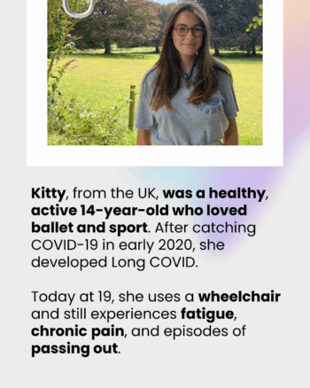 «Η Kitty, από το Ηνωμένο Βασίλειο, ήταν ένα υγιές, δραστήριο 14χρονο κορίτσι που αγαπούσε το μπαλέτο και τον αθλητισμό. Αφού νόσησε με COVID-19 στις αρχές του 2020, εμφάνισε Long COVID. Σήμερα, στα 19, χρησιμοποιεί αναπηρικό αμαξίδιο και συνεχίζει να αντιμετωπίζει κόπωση, χρόνιο πόνο και επεισόδια λιποθυμίας».