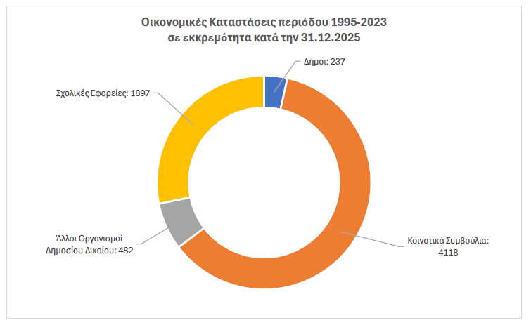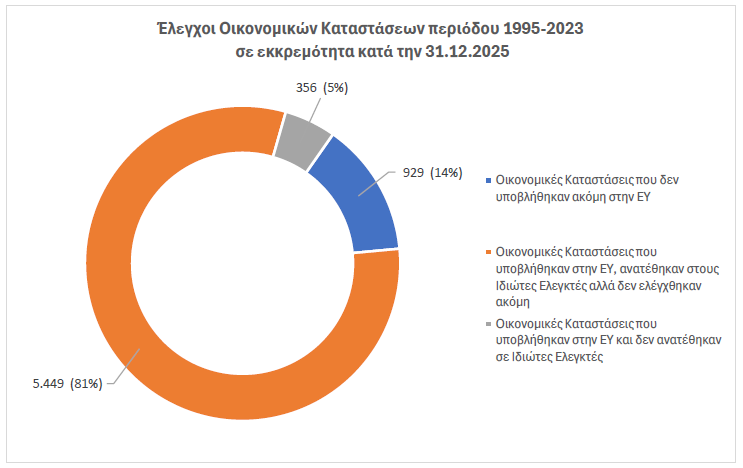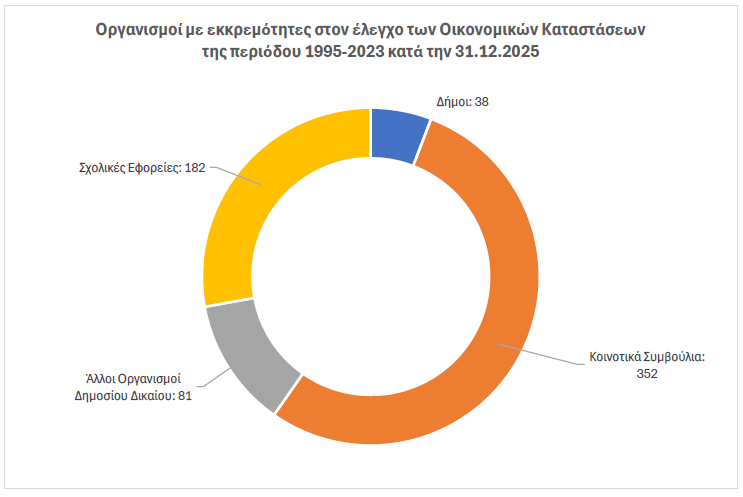 Σύμφωνα με τα στοιχεία της έκθεσης, μέχρι τις 31 Δεκεμβρίου 2025 εκκρεμούσε ο έλεγχος 6.734 οικονομικών καταστάσεων που αφορούν την περίοδο 1995–2023. Οι εκκρεμότητες αυτές προέρχονται κυρίως από Κοινοτικά Συμβούλια, Σχολικές Εφορίες, Δήμους και άλλους οργανισμούς δημοσίου δικαίου.