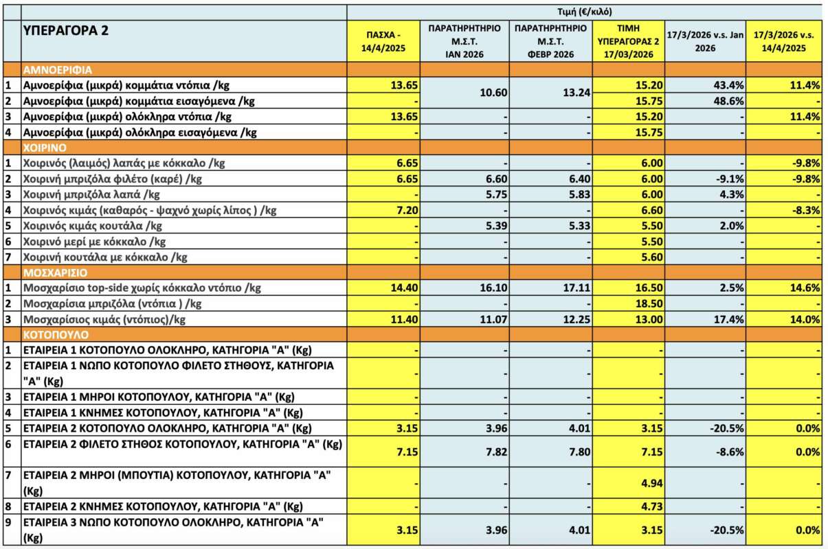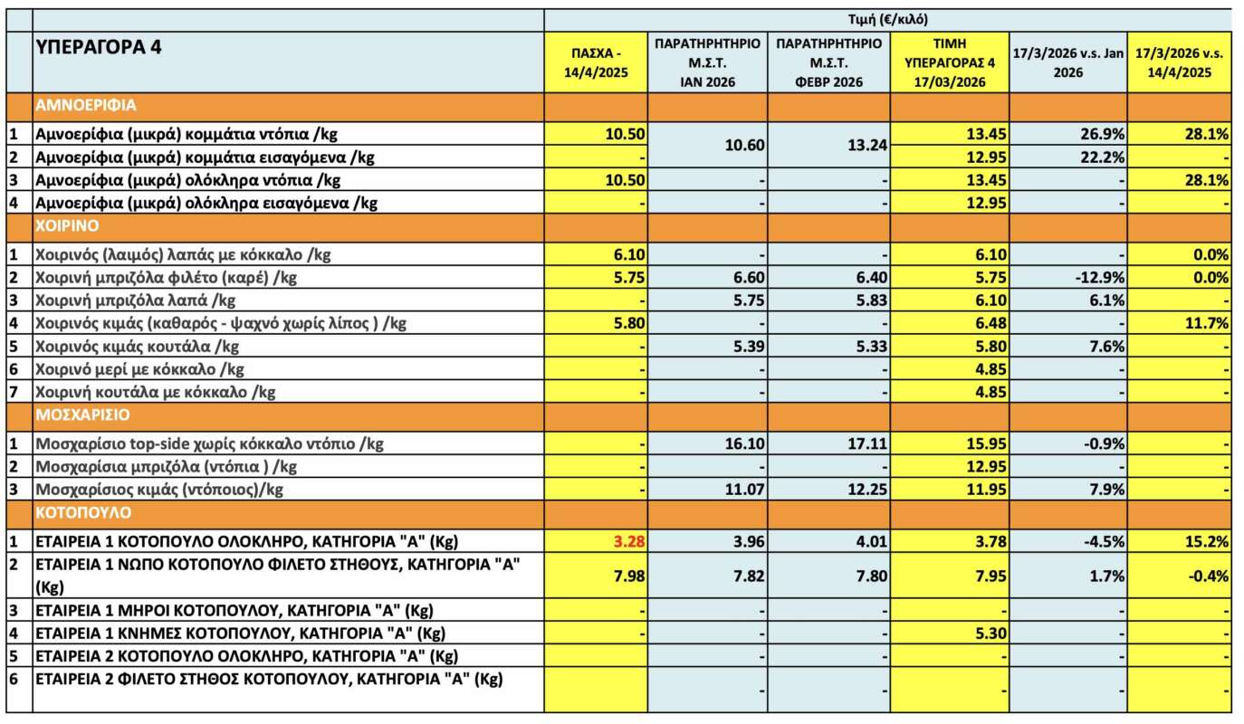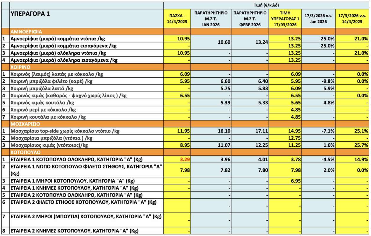 Η καταγραφή των τιμών έγινε στις 17 Μαρτίου, σε τέσσερις υπεραγορές. Όπως προκύπτει, οι τιμές αμνοεριφίων είναι ανεβασμένες κατά 2-3 ευρώ το κιλο. Μεγαλύτερη αύξηση καταγράφουν οι τιμές του βοδινού κρέατος, ενώ οι τιμές για το κοτόπουλο δεν παρουσιάζουν ιδιαίτερες μεταβολές.