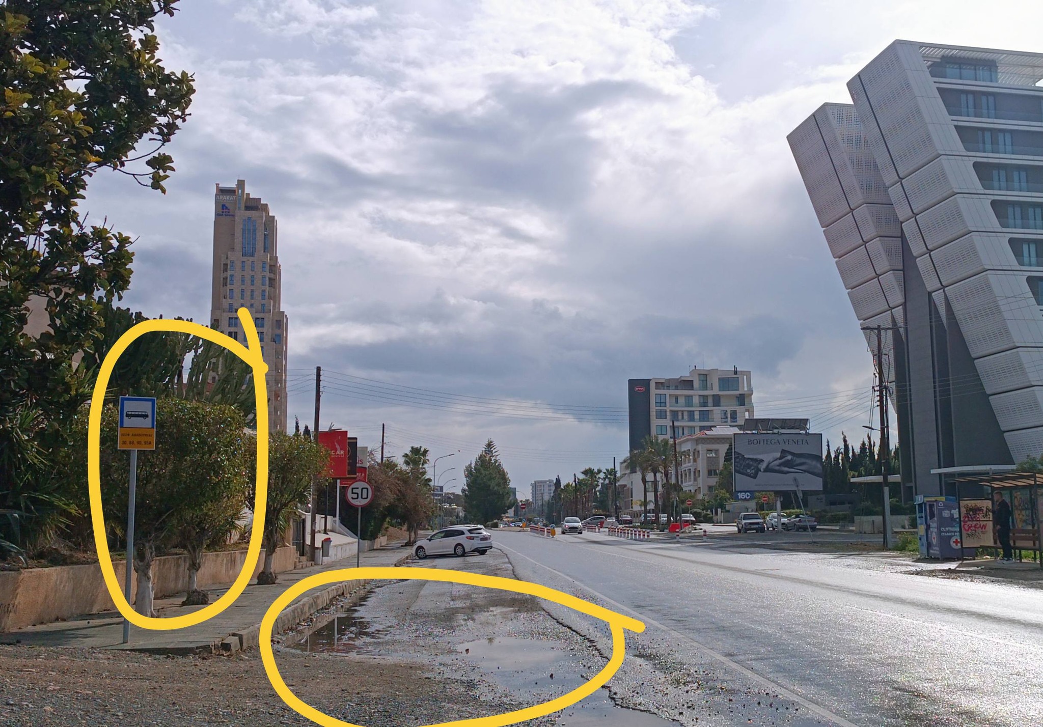 Οπως σχολίασε ο πολίτης «Η Λεμεσός πετά! Σύγχρονη στάση λεωφορείων στην καρδιά της ( πιο ακριβής) τουριστικής περιοχής της Λεμεσού. Ούτε κάθισμα, ούτε στέγαστρο. Μόνο μια πινακίδα μπροστά από μια λακκούβα»