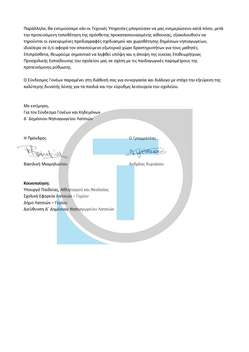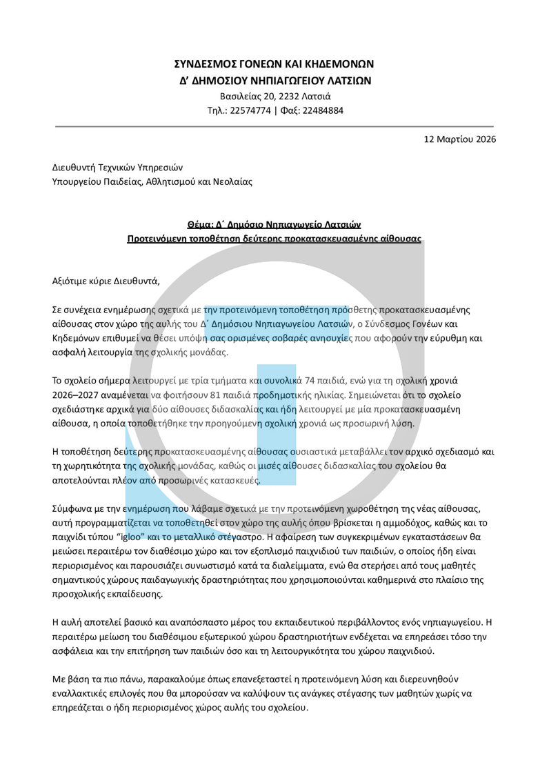 Μέσω της επιστολής, η οποία κοινοποιήθηκε και στην Υπουργό Παιδείας, ζητείται η άμεση επανεξέταση της απόφασης και η εξεύρεση εναλλακτικών λύσεων που δεν θα αποβαίνουν εις βάρος της ασφάλειας των παιδιών. Παράλληλα, οι γονείς ζητούν να ληφθεί σοβαρά υπόψη η άποψη της οικείας Επιθεωρήτριας Προσχολικής Εκπαίδευσης, ώστε οι παιδαγωγικές ανάγκες των νηπίων να μην θυσιαστούν στον βωμό των πρόχειρων τεχνικών διευθετήσεων.