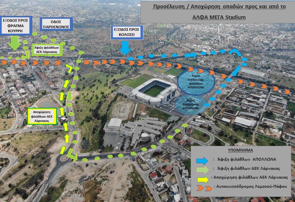 Για την ομαλή προσέλευση τους στο στάδιο, οι οπαδοί του ΑΠΟΛΛΩΝ καλούνται να κατευθυνθούν προς το ΑΛΦΑΜΕΓΑ Stadium, μέσω του αυτοκινητόδρομου προς Πάφο, να ακολουθήσουν την έξοδο προς Κολόσσι και ακολούθως μέσω της αερογέφυρας, να ακολουθήσουν τη στροφή δεξιά προς το στάδιο.