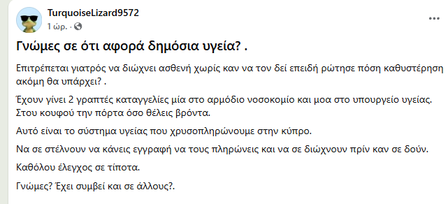 Παράλληλα, δεν έλειψαν και πιο αιχμηρές τοποθετήσεις, με πολίτες να συνδέουν το περιστατικό με ευρύτερα ζητήματα λειτουργίας του ΓεΣΥ, κάνοντας λόγο για προβλήματα στην εξυπηρέτηση ασθενών.