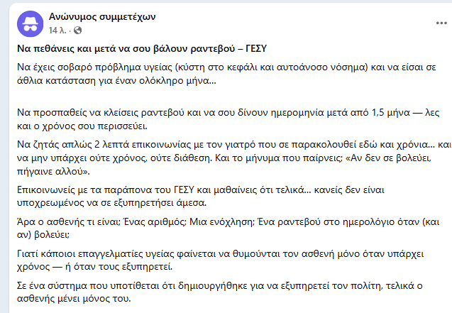 Ο πολίτης εκφράζει έντονη απογοήτευση για τη λειτουργία του συστήματος, διερωτώμενος αν «ο ασθενής είναι απλώς ένας αριθμός», ενώ σημειώνει ότι ακόμη και μετά από επικοινωνία με την υπηρεσία παραπόνων ενημερώθηκε πως δεν υπάρχει υποχρέωση άμεσης εξυπηρέτησης.