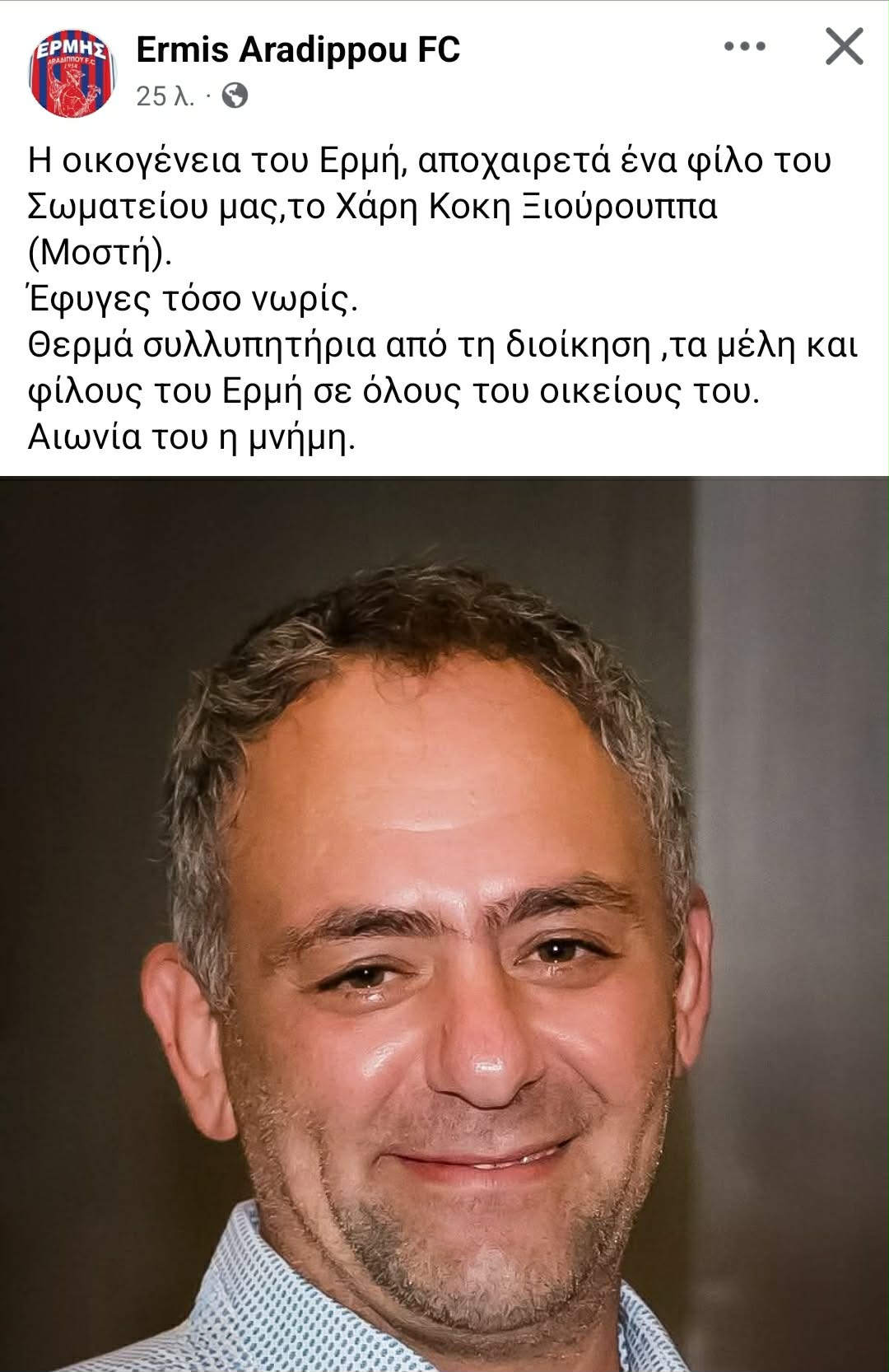 Έφυγε από τη ζωή ο φίλος του Ερμή Αραδίππου Χάρης Κοκής Ξιούρουππας (Μοστή), σκορπίζοντας θλίψη σε συγγενείς και φίλους.